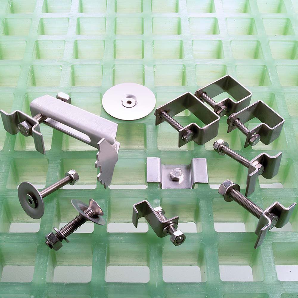 M.M. ofrece accesorios de fijación y conexión, soportes fijos y ajustables para rejillas, así como una amplia gama de accesorios que simplifican la instalación y mejoran la seguridad de las estructuras de PRFV.